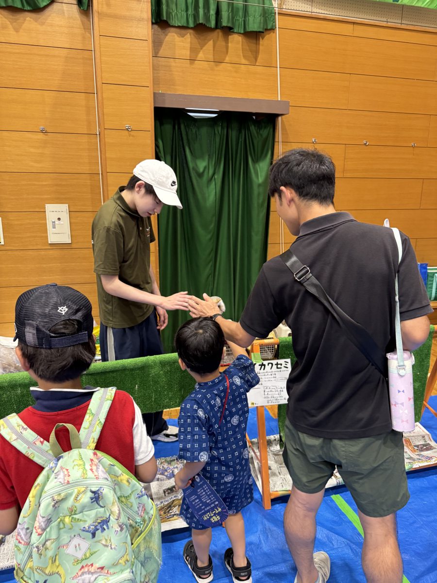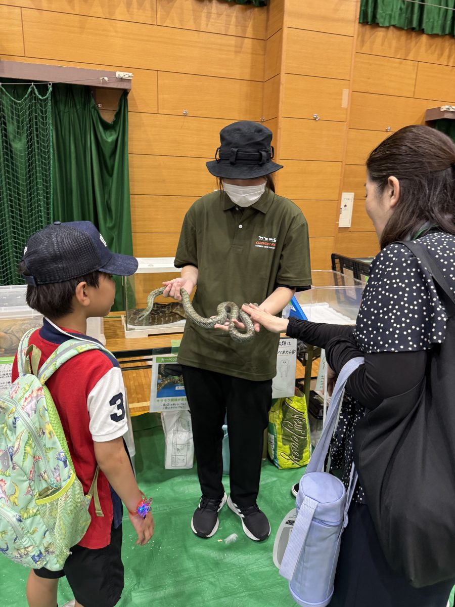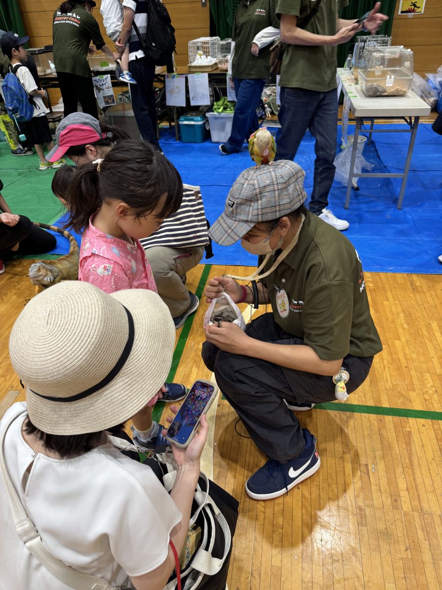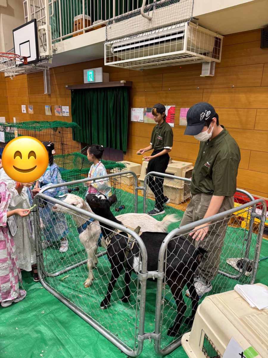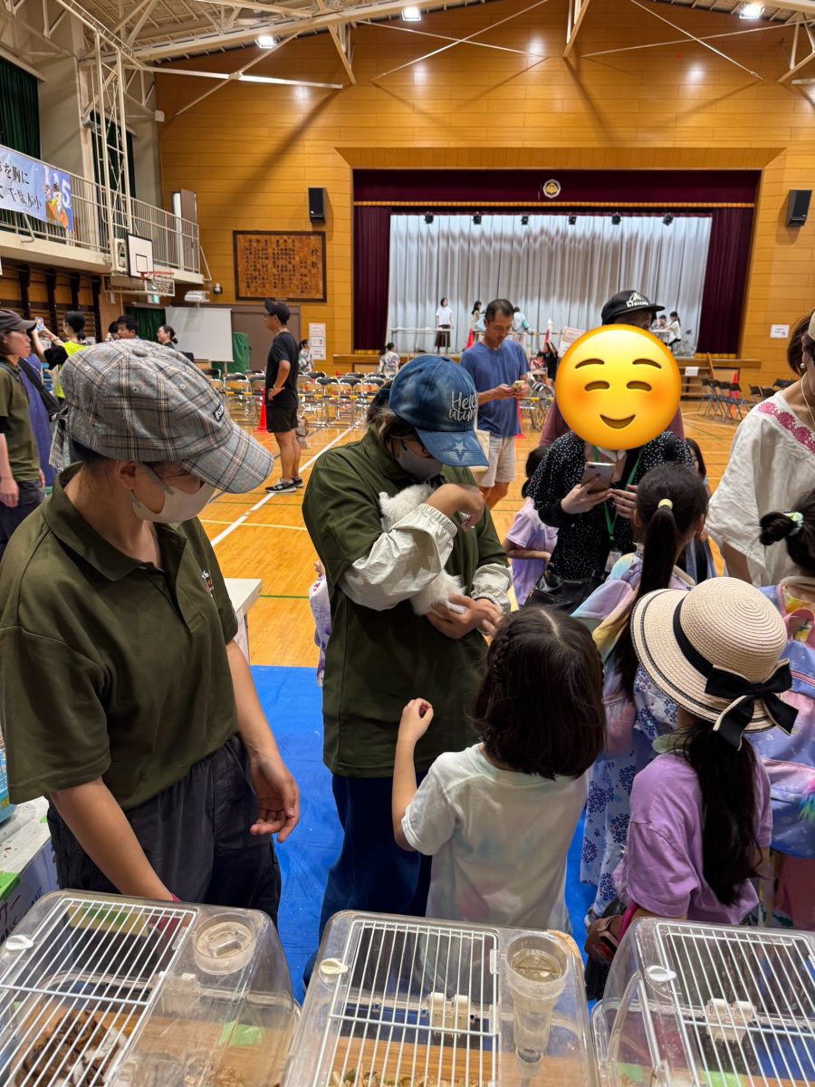 毎年子供達が全員参加の夏祭り16時から20時までと子供達にとっては、とても楽しい夜更かしタイムの夏祭りがあります。毎年大人気の移動動物園です。時間で決められていますが、ウサギコーナーが毎回パンクします。浴衣を着た子供達がウサギ達のおやつをあげたり、ヘビを首に巻いたりと楽しんでもらいました。夏の移動動物園は、温度管理が大変です。小学校の体育館は、冷房がとてもよく効きます。人口密度によっても温度が変わります。動物達も交代でお休みをとりつつ、夜の移動動物園を頑張りました。普段寝ている時に移動動物園を行っている、ハムスターやモモンガが後半とても活発になり、元気いっぱいでした!